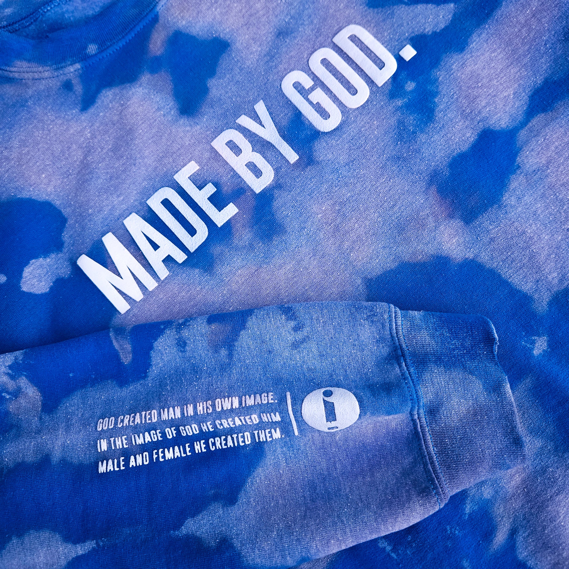 The colour of the sweater is achieved with a tie-dye wash, creating a slightly washed tone to the garment. It is finished with IMAGESAREMADE branding to the chest, back, sleeve and IMAGESAREMADE embroidered bar to the back.
