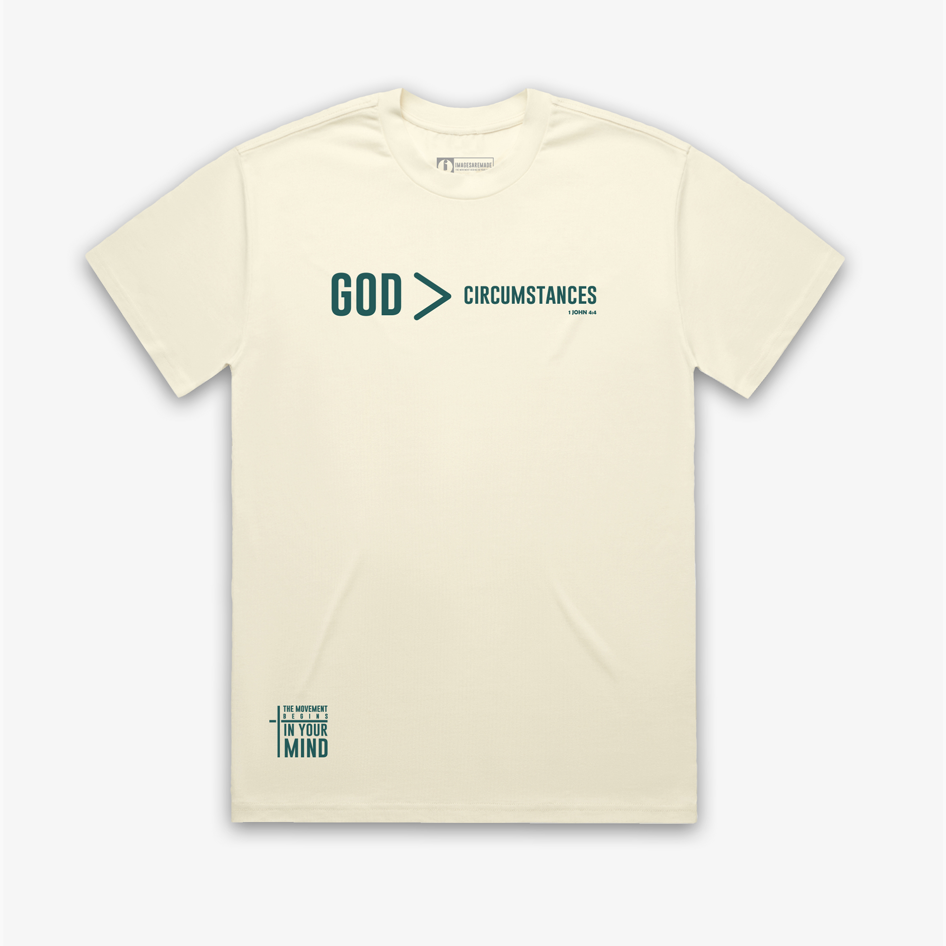 God Is Greater than our circumstances. He never said that weapons would not form but He stated that it will not prosper. This relaxed fit, heavyweight crew neck t-shirt has the GOD > Circumstances logo on the front to remind us of the God we serve. The back has the statement "Greater is HE that is in me than he that is in the world". This statement reminds us to cast all of our problems and concerns of this world to God because He is Greater!